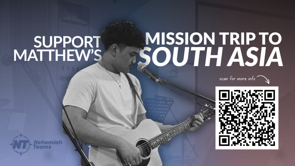I pray you are doing well! I wanted to share an amazing opportunity that the Lord has given me. This summer I’ve been given the chance to serve the under-served in South Asia through the International Mission Board’s: Nehemiah Teams. The Lord has also granted me a leadership role in this mission trip, and I am continually reminded that true leadership comes from full submission to Him.